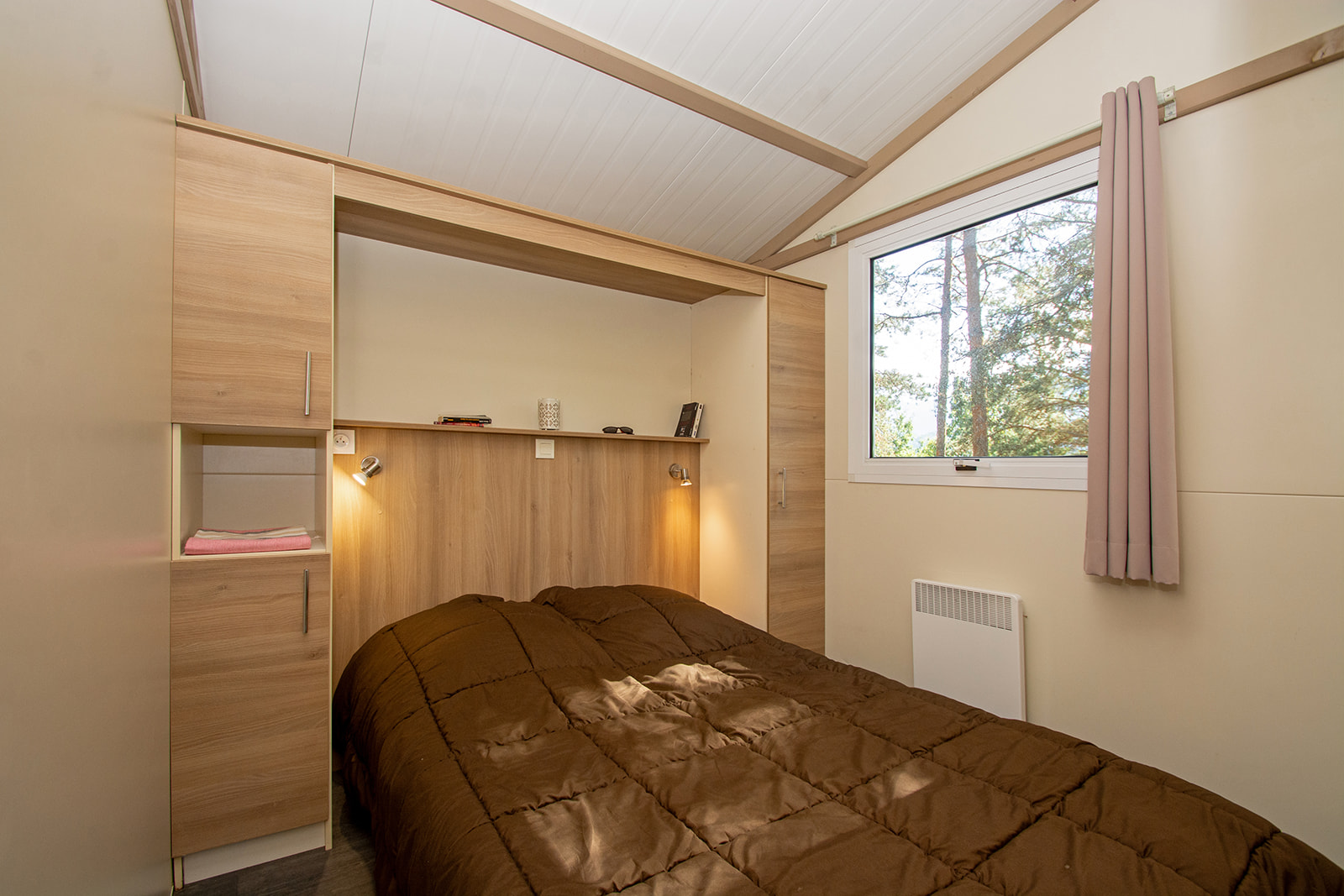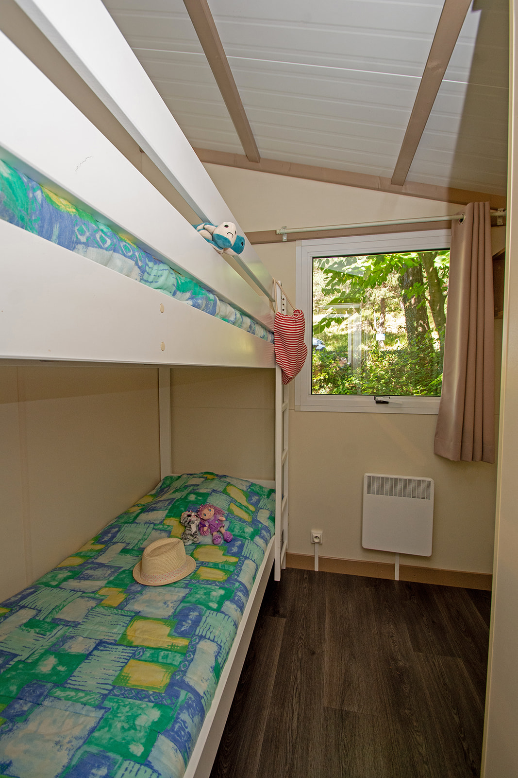 One bedroom with a double bed, one bedroom with two twin beds and one bedroom with two bunk beds.