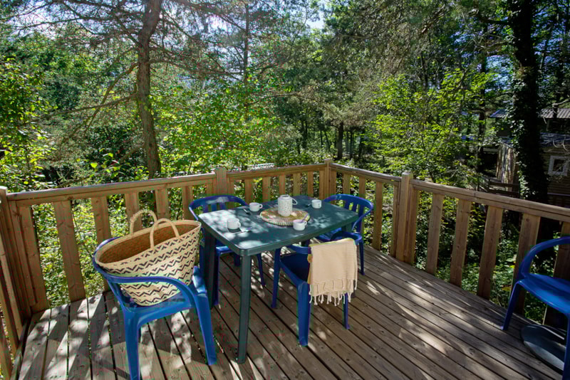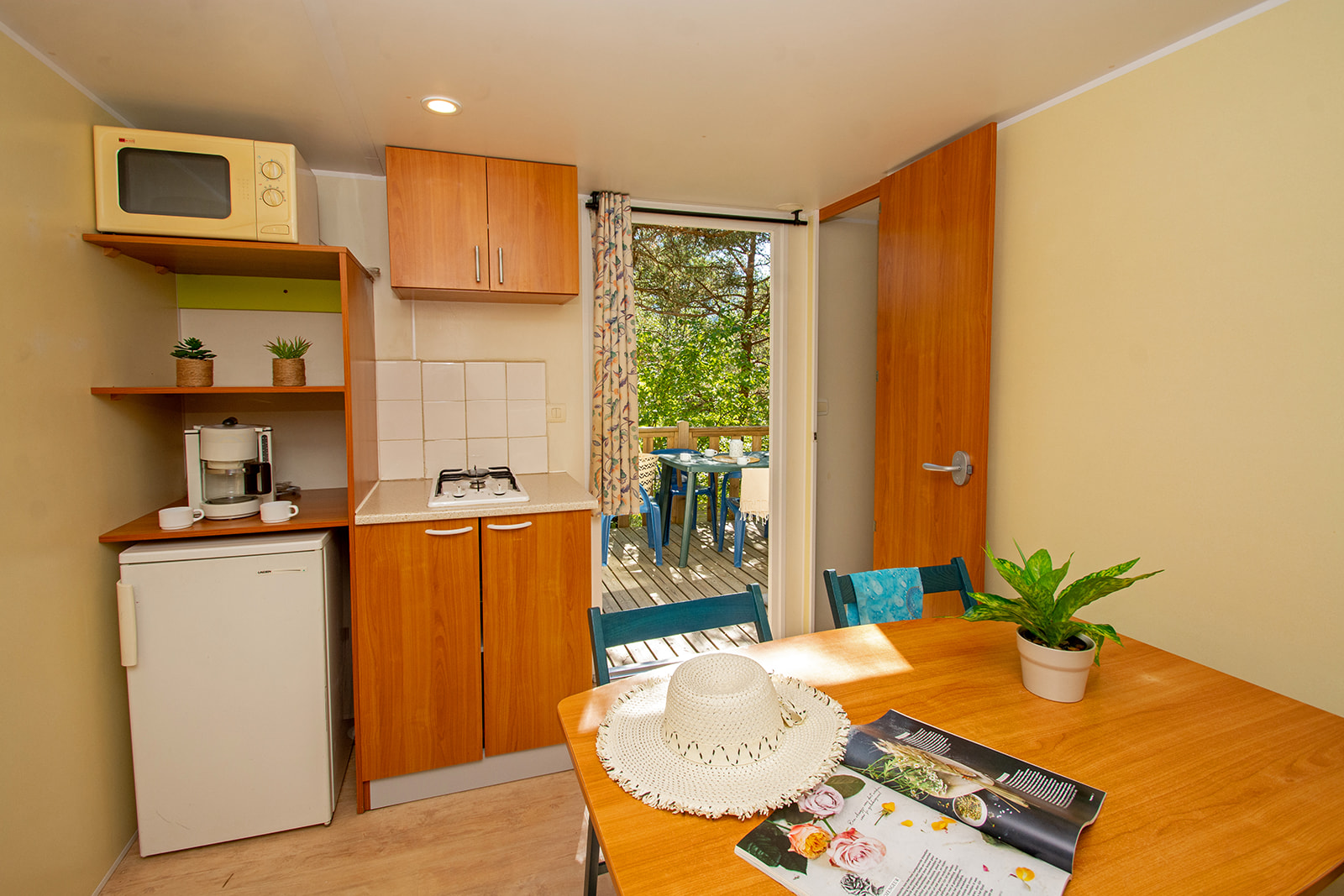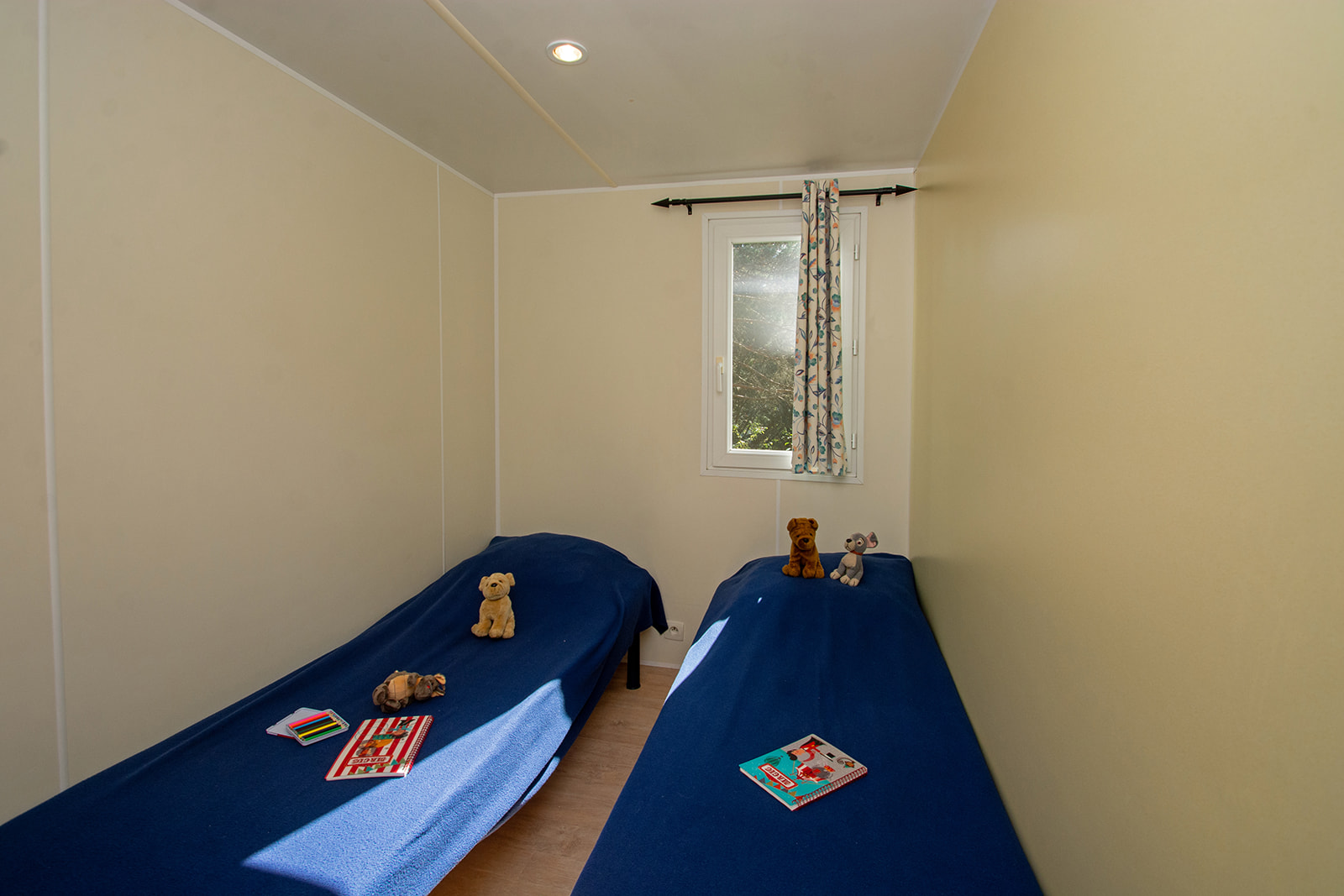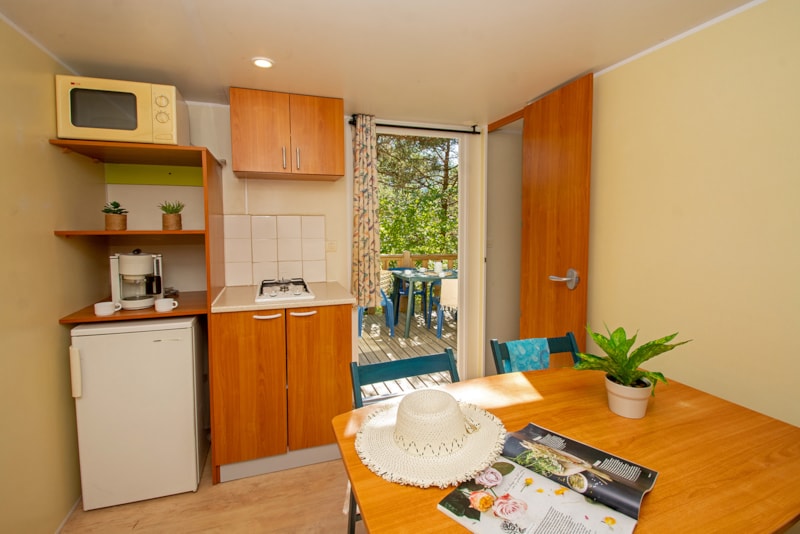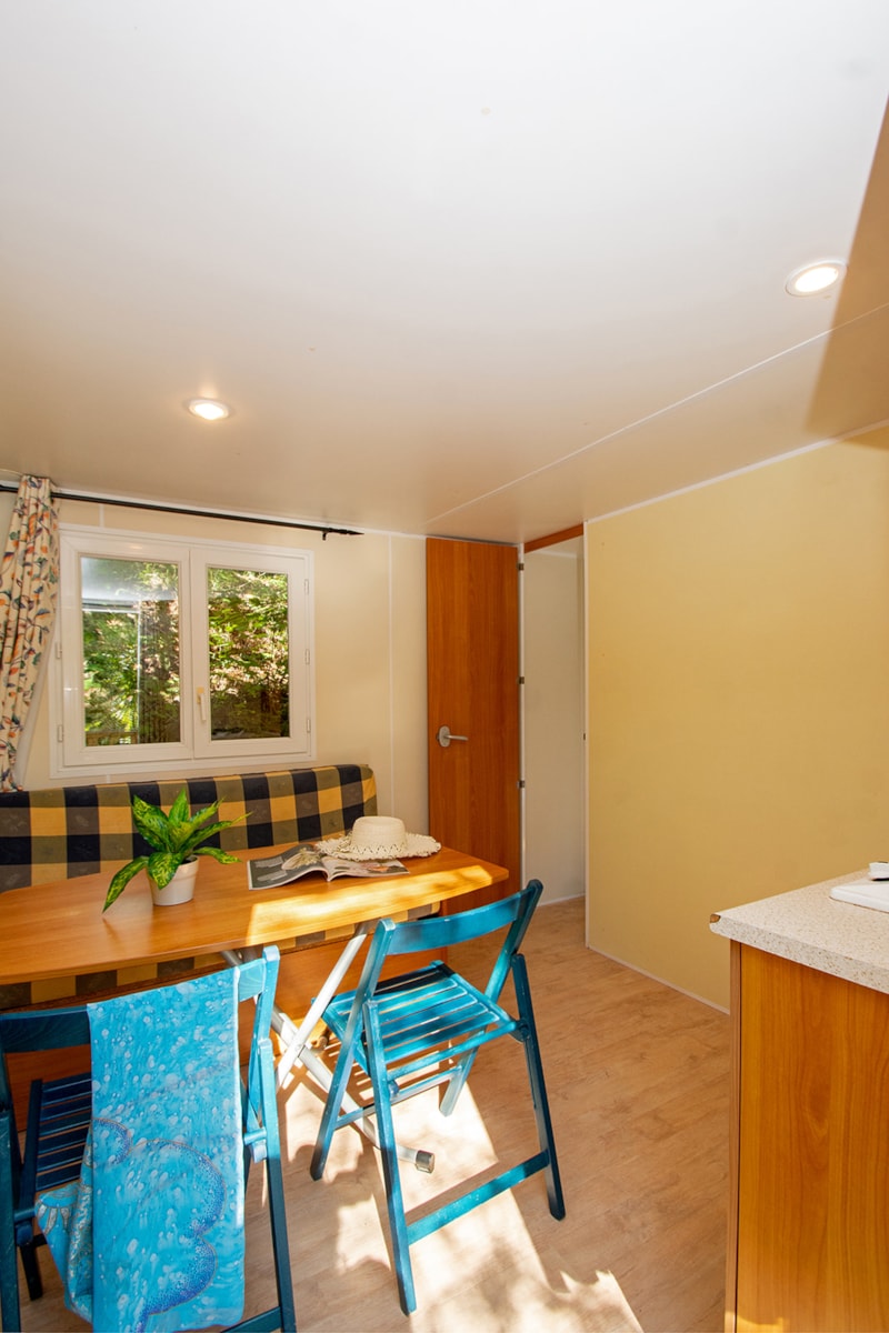 Mobil home proche sanitaires avec confort intérieur et 2 chambres séparées.