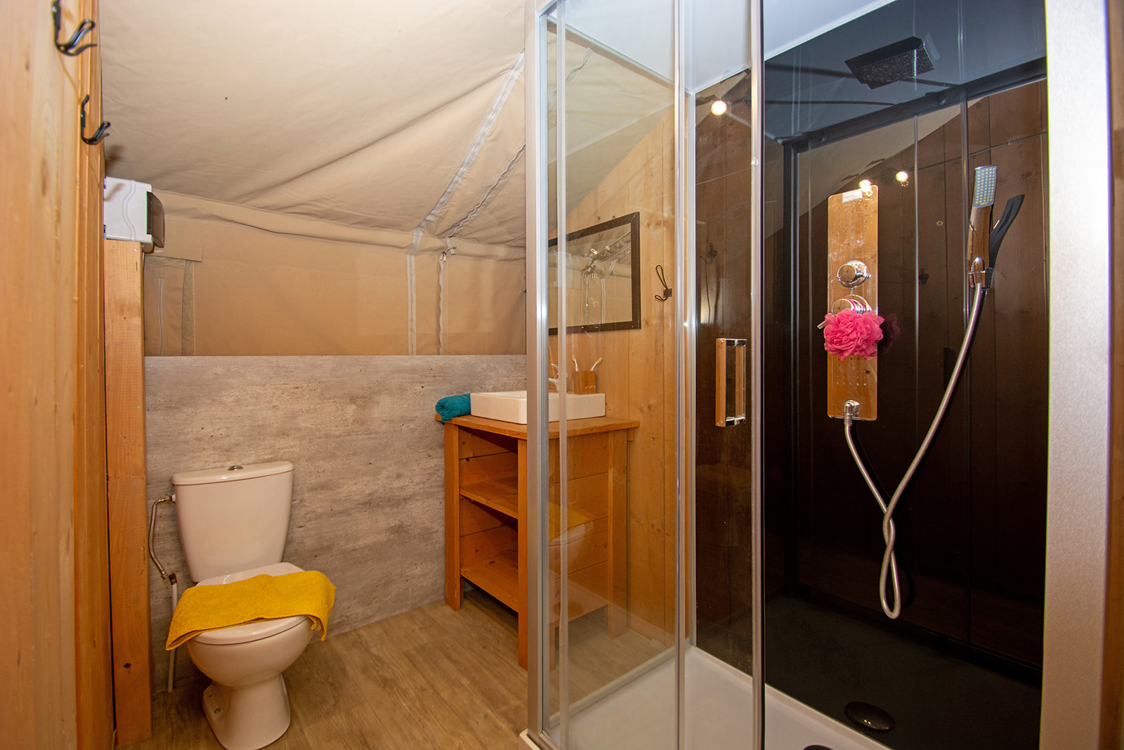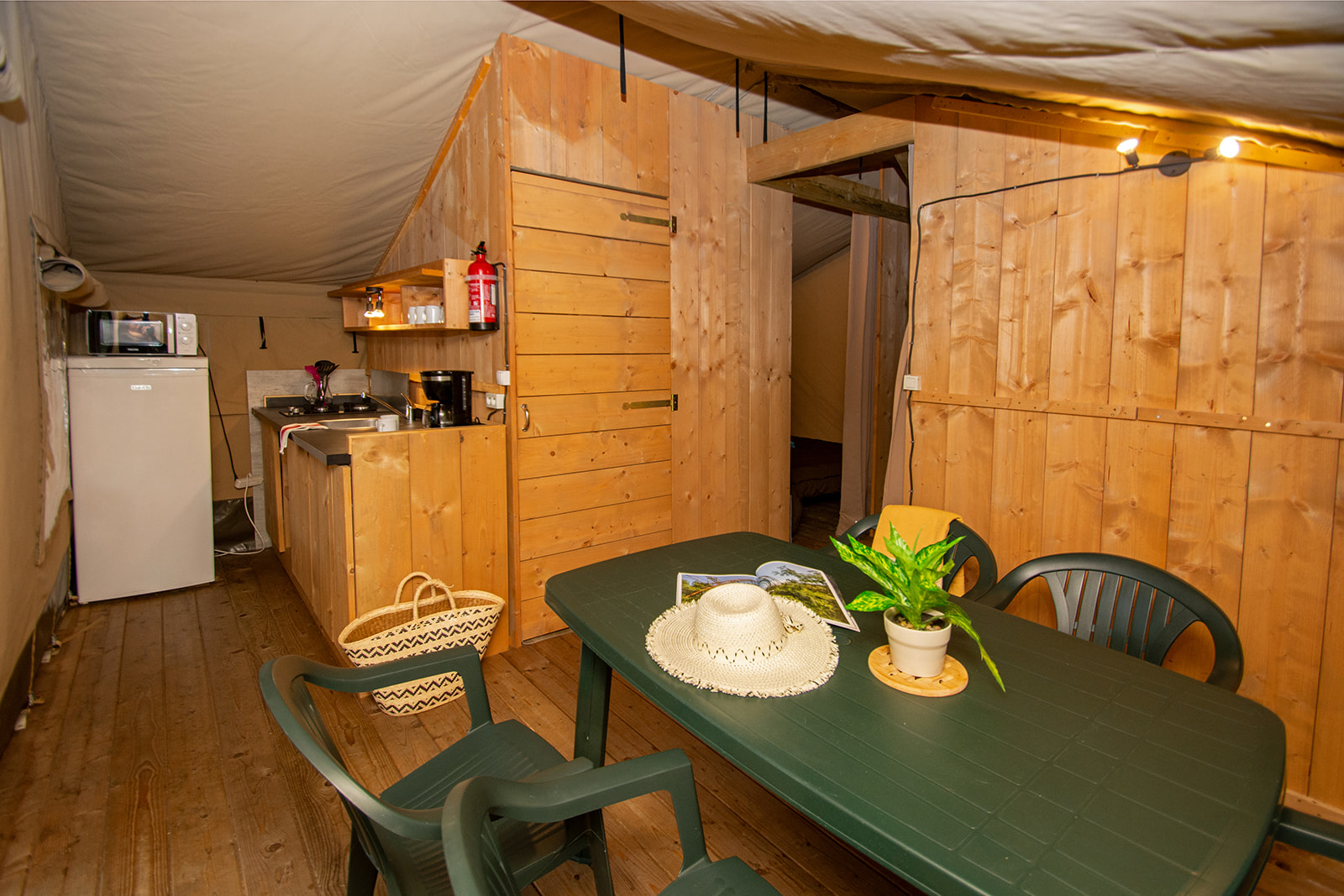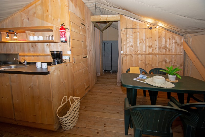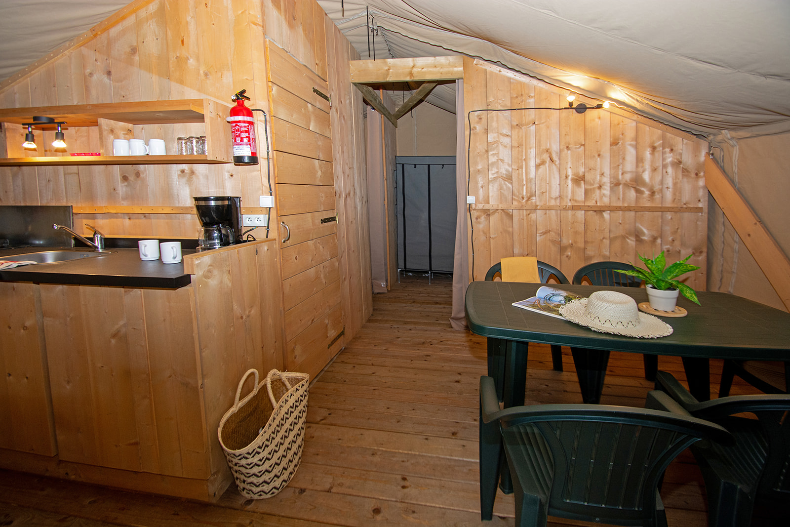 Cette tente de 25m² permet d'accueillir 5 personnes. Elle est équipée d'une terrasse de 13.50m² avec salon de jardin et possède un séjour avec coin cuisine, 1 salle de douche avec WC et 2 chambres.