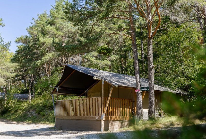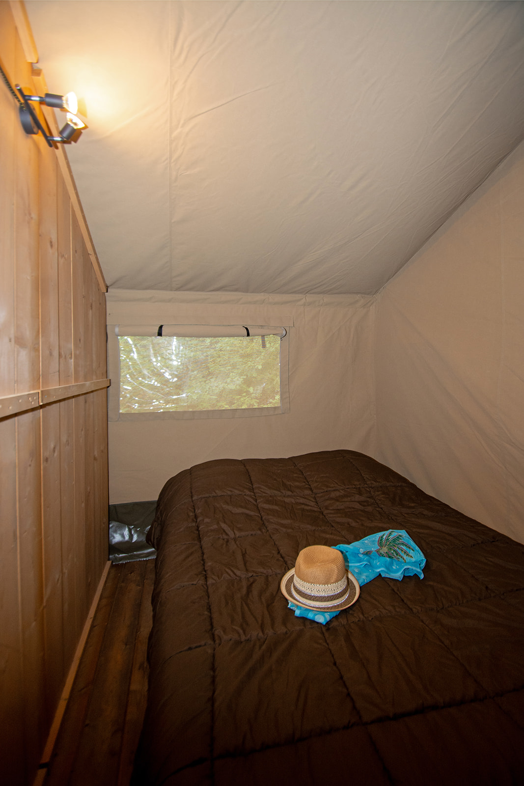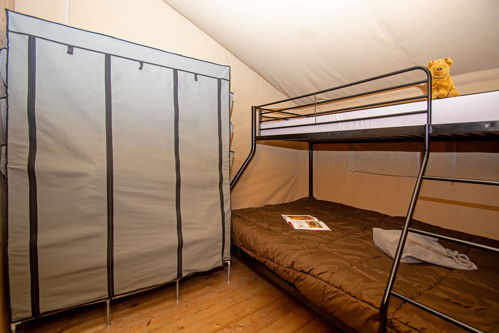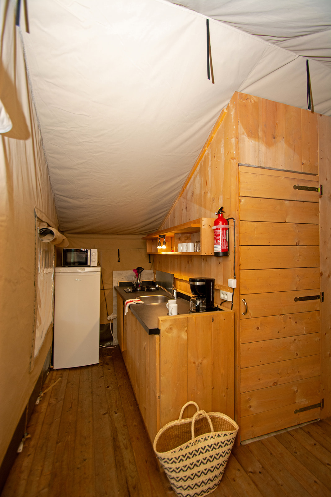 Cette tente de 25m² permet d'accueillir 5 personnes. Elle est équipée d'une terrasse de 13.50m² avec salon de jardin et possède un séjour avec coin cuisine, 1 salle de douche avec WC et 2 chambres.
