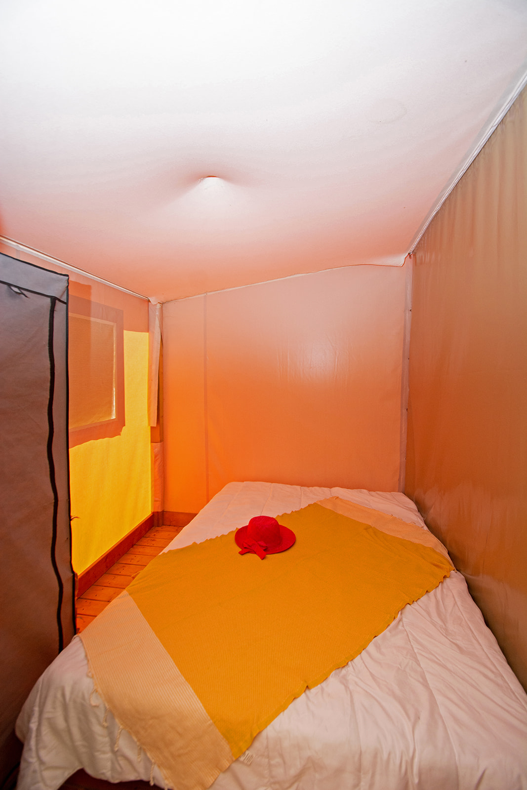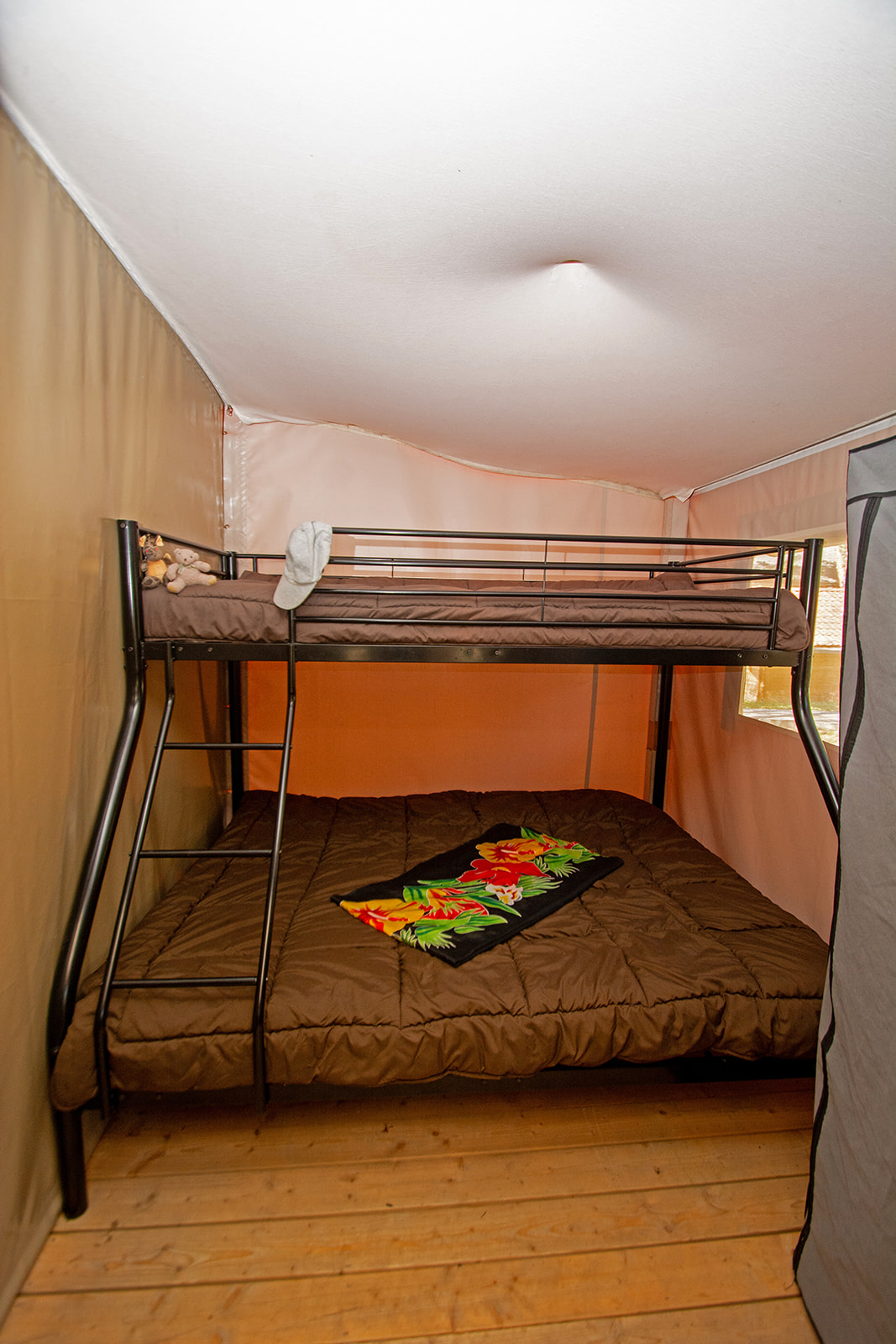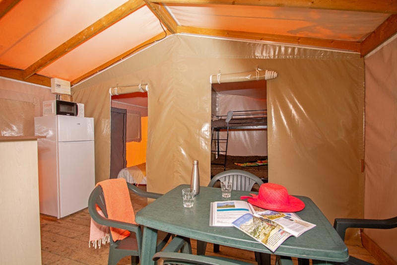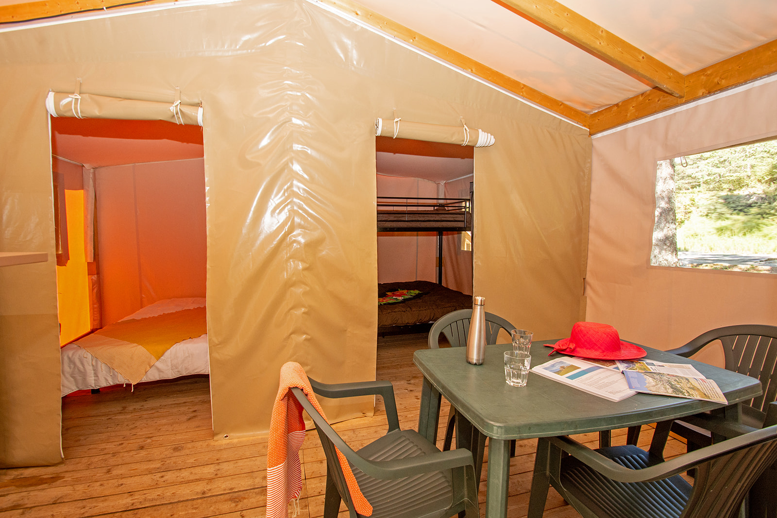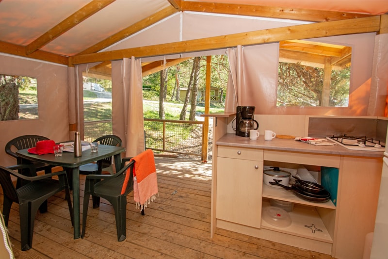 Tente lodge idéale pour retrouver les joies du camping avec un maximum de confort (coin cuisine équipée et literie).
