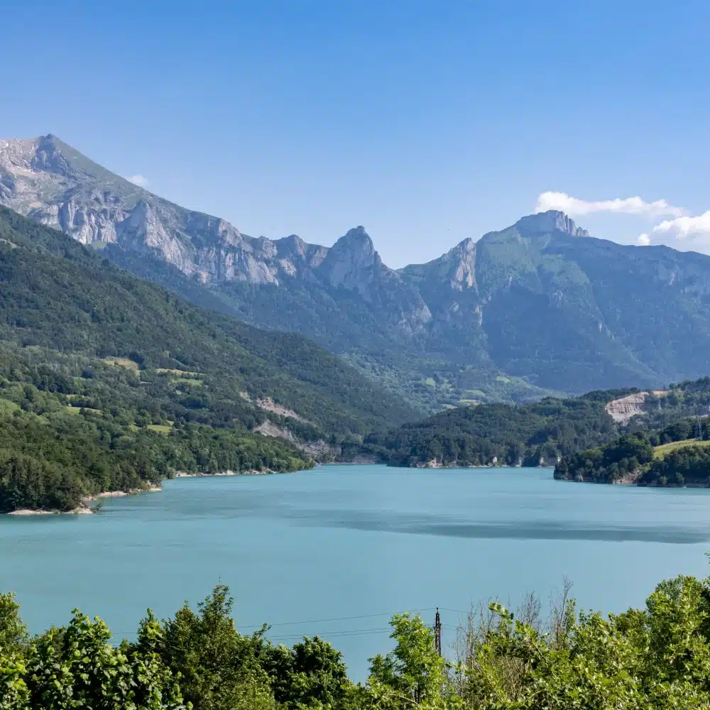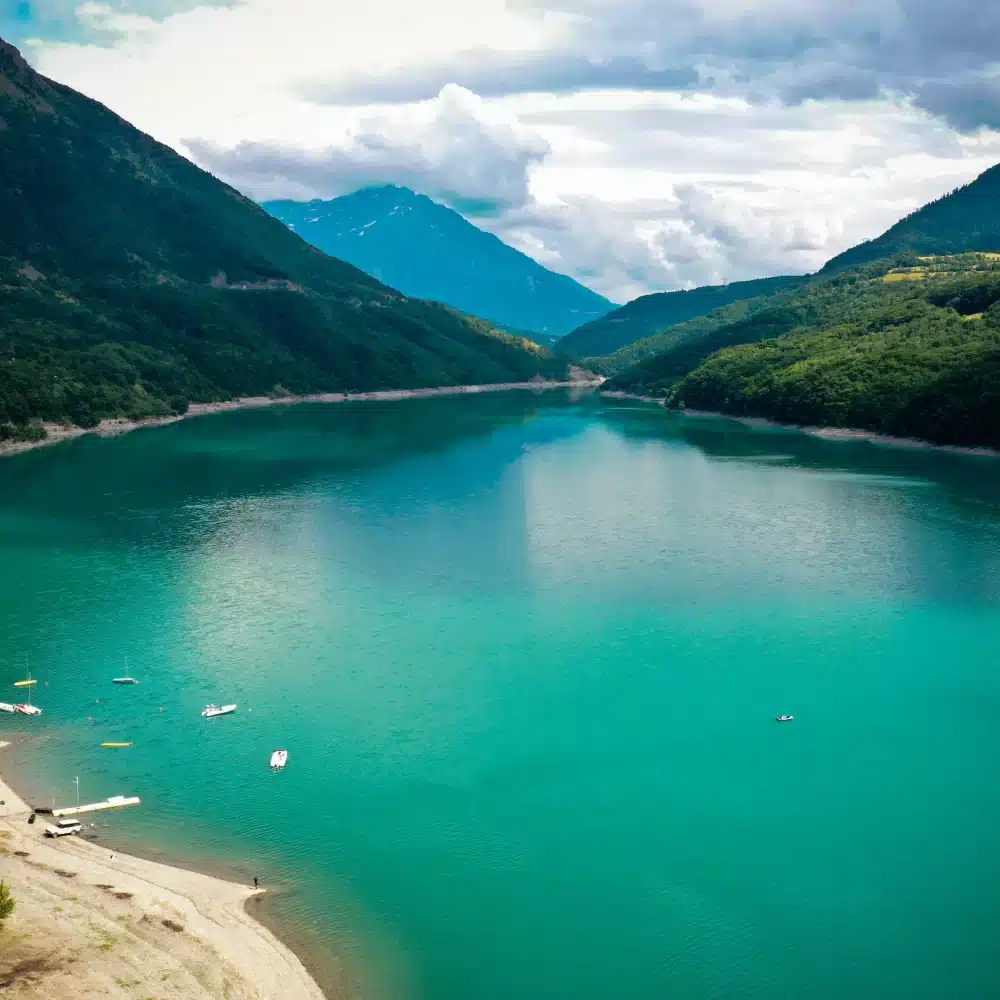 À seulement 15 minutes du Camping Le Champ Long, le lac du Sautet est un petit coin de paradis pour tous ceux qui aiment la nature et les activités de plein air. Niché entre l’Isère et les Hautes-Alpes, ce plan d’eau entouré de montagnes offre un cadre spectaculaire pour se baigner, naviguer, grimper ou simplement chiller en famille.